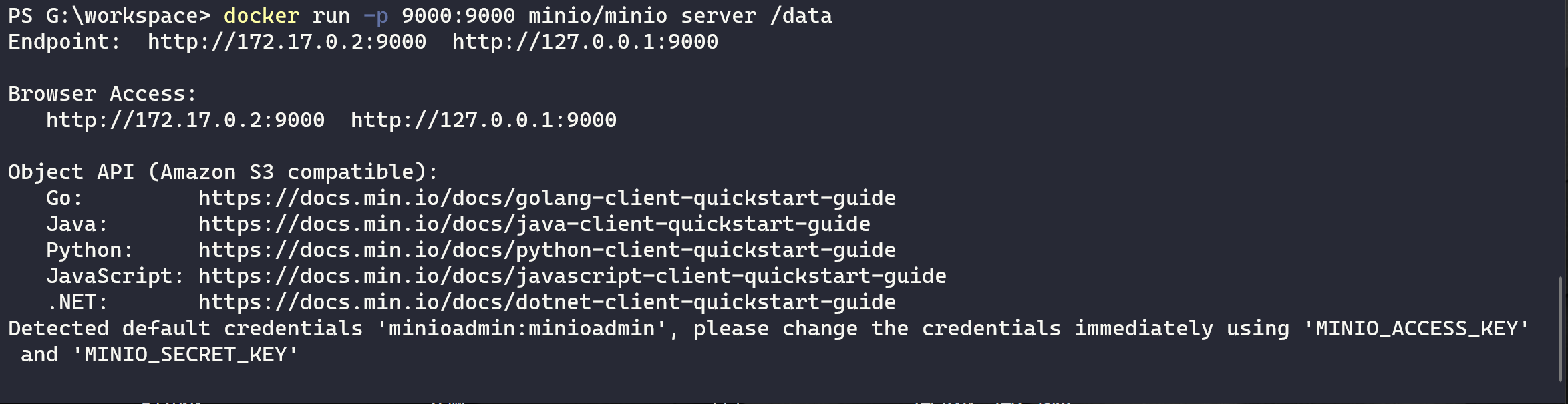 docker run -p 9000:9000 minio/minio server /data