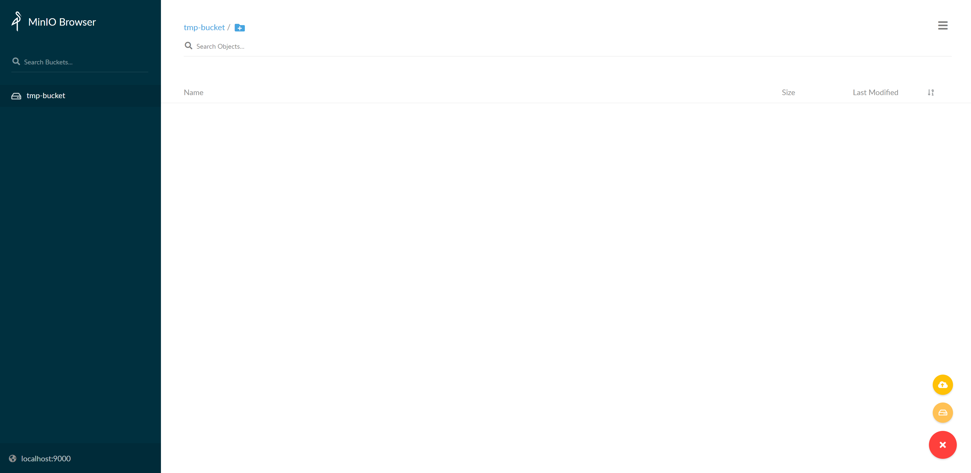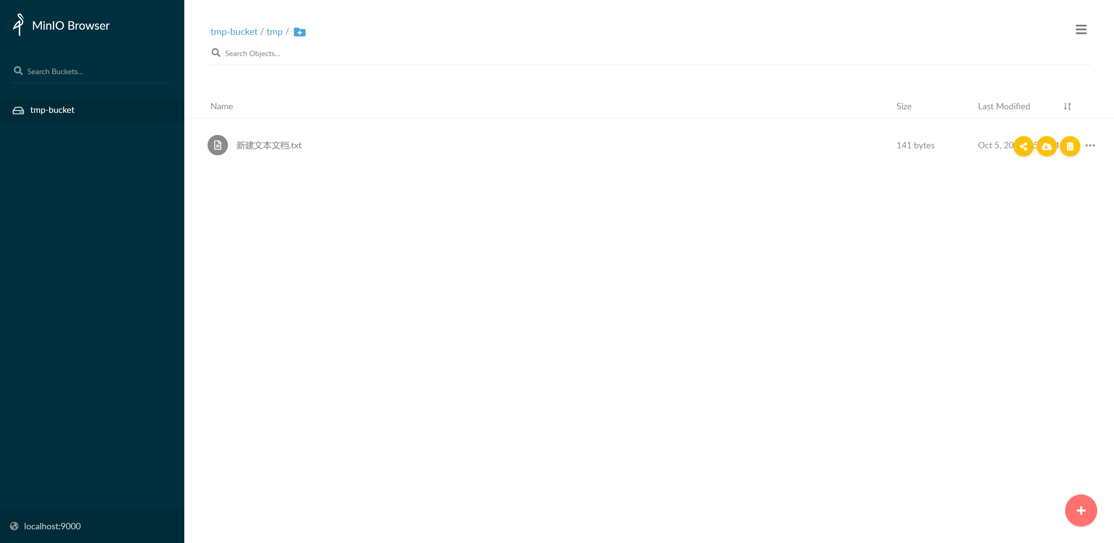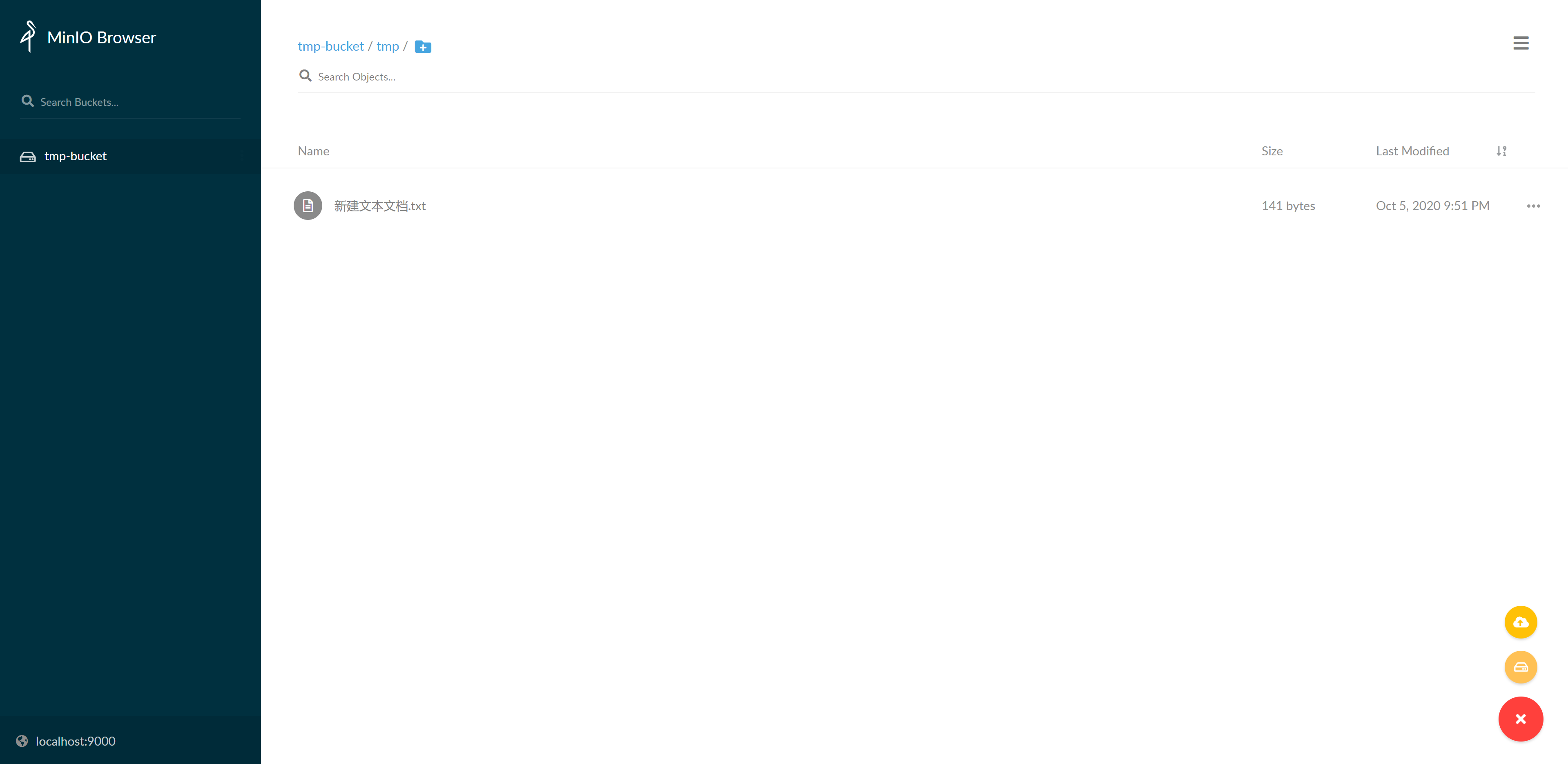 +按钮,跳过这个按钮可以创建指定名称的目录,在上个步骤中右下角的+中提供了upload file的功能,可以让我们快速地上传一个文件,如以下示例,在路径为tmp-bucket/tmp/的目录下,上传了一个文件名为新建文本文档.txt的文件